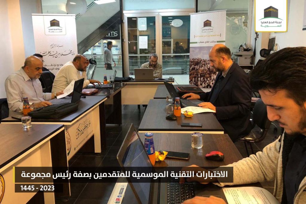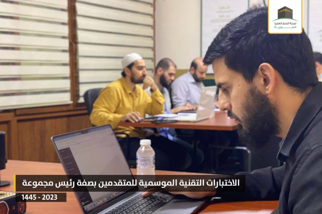 أنهت لجنة الحج العليا السورية الاختبارات الكتابية كاملة للصفات الإداريّة (رئيس مجموعة – موجه/ـة ديني – معاون – منسق تقني) كما أنهت الاختبار التقني للمتقدمين بصفة رئيس مجموعة.