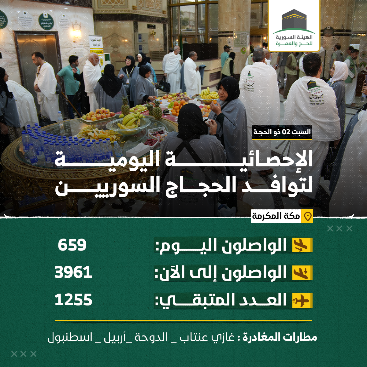 الإحصائيّة اليوميّة لتوافد الحجّاج السّورييّن إلى المملكة العربيّة السّعوديّة لأداء فريضة الحجّ لعام 1445 هـ – 2024 م