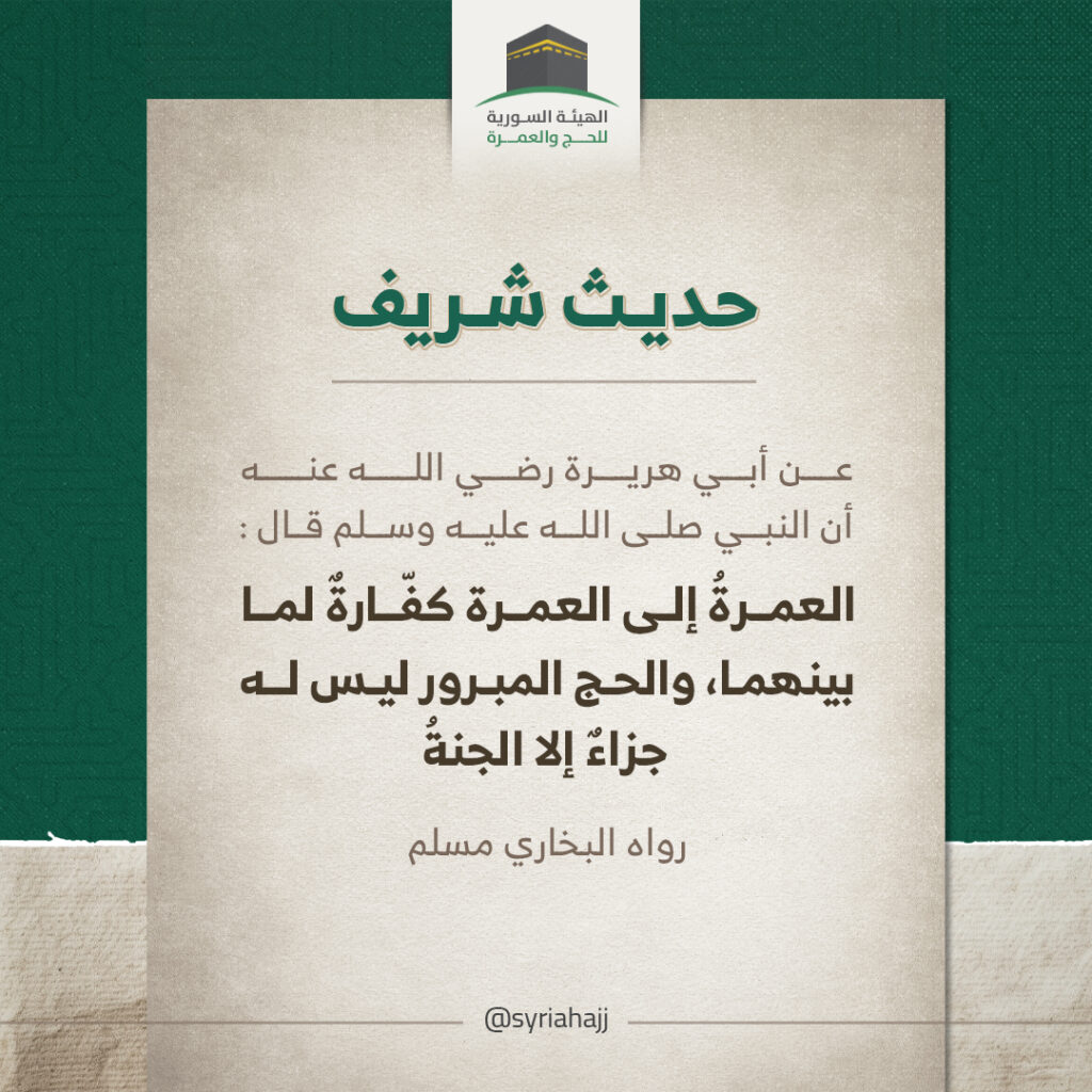 عن أبي هريرة رضي اللهُ عنه أن النبي صلى اللهُ عليه وسلم قال: “الْعُمْرَةُ إِلَى الْعُمْرَةِ كَفَّارَةٌ لِمَا بَيْنَهُمَا، وَالْحَجُّ الْمَبْرُورُ لَيْسَ لَهُ جَزَاءٌ إِلَّا الْجَنَّةُ”. [رواه البخاري ومسلم في صحيحيهما].