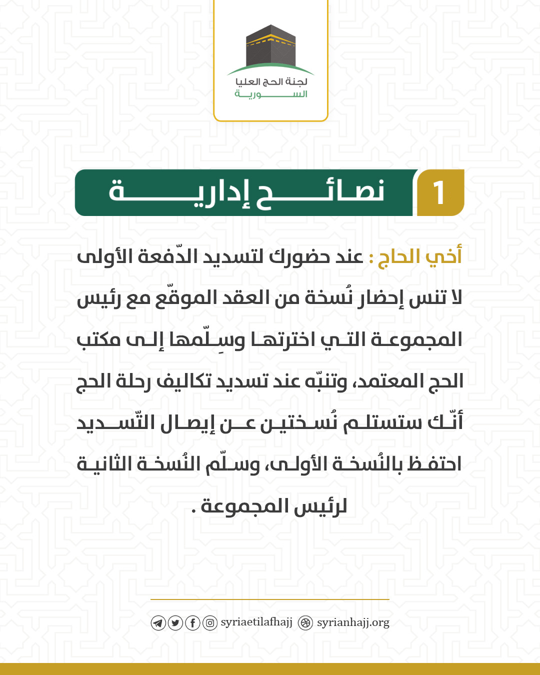 أخي الحاج: عند حضورك لتسديد الدّفعة الأولى لا تنس إحضار نُسخة من العقد الموقّع مع رئيس المجموعة التي اخترتها وسلِّمها إلى مكتب الحج المعتمد، وتنبّه عند تسديد تكاليف رحلة الحج أنّك ستستلم نُسختين عن إيصال التّسديد، احتفظ بالنُسخة الأولى، وسلّم النُسخة الثانية لرئيس المجموعة.