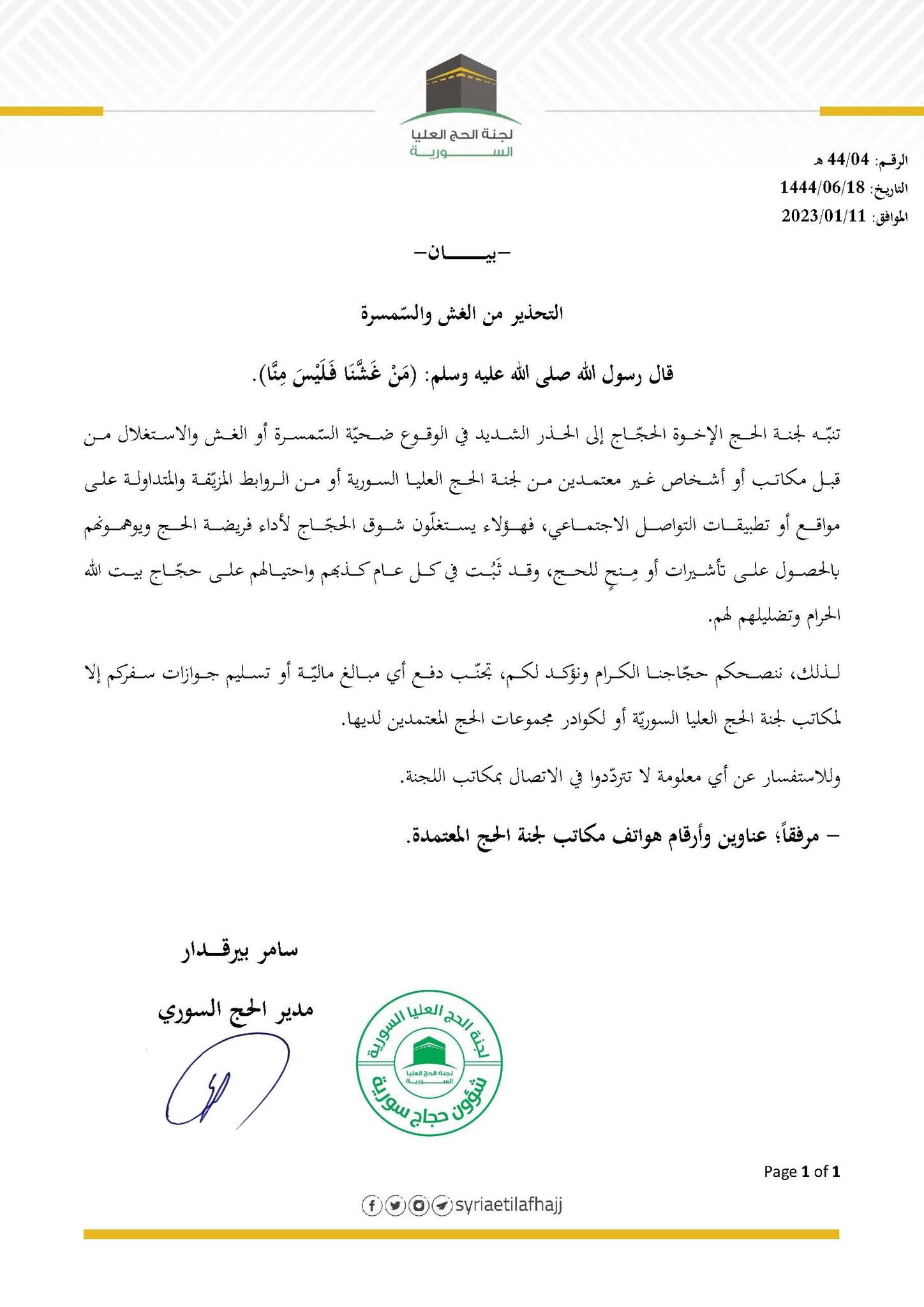 لذلك، ننصحكم حجّاجنا الكرام ونؤكد لكم، تجنّب دفع أي مبالغ ماليّة أو تسليم جوازات سفركم إلا لمكاتب لجنة الحج العليا السوريّة أو لكوادر مجموعات الحج المعتمدين لديها.
