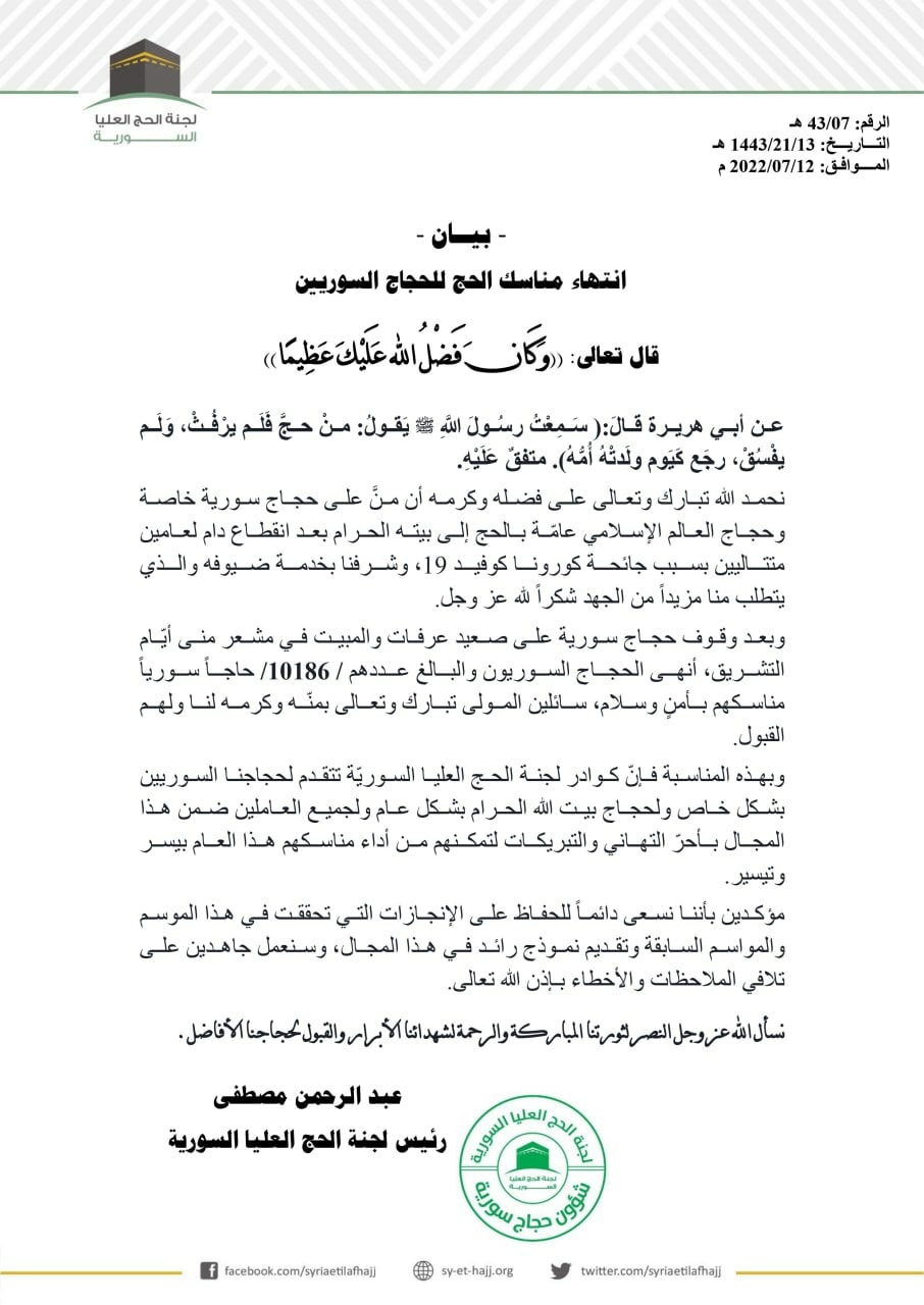 وبعد وقوف حجاج سورية على صعيد عرفات والمبيت في مشعر منى أيّام التشريق، أنهى الحجاج السوريون والبالغ عددهم / 10186/ حاجاً سورياً مناسكهم بأمنٍ وسلام، سائلين المولى تبارك وتعالى بمنّه وكرمه لنا ولهم القبول.