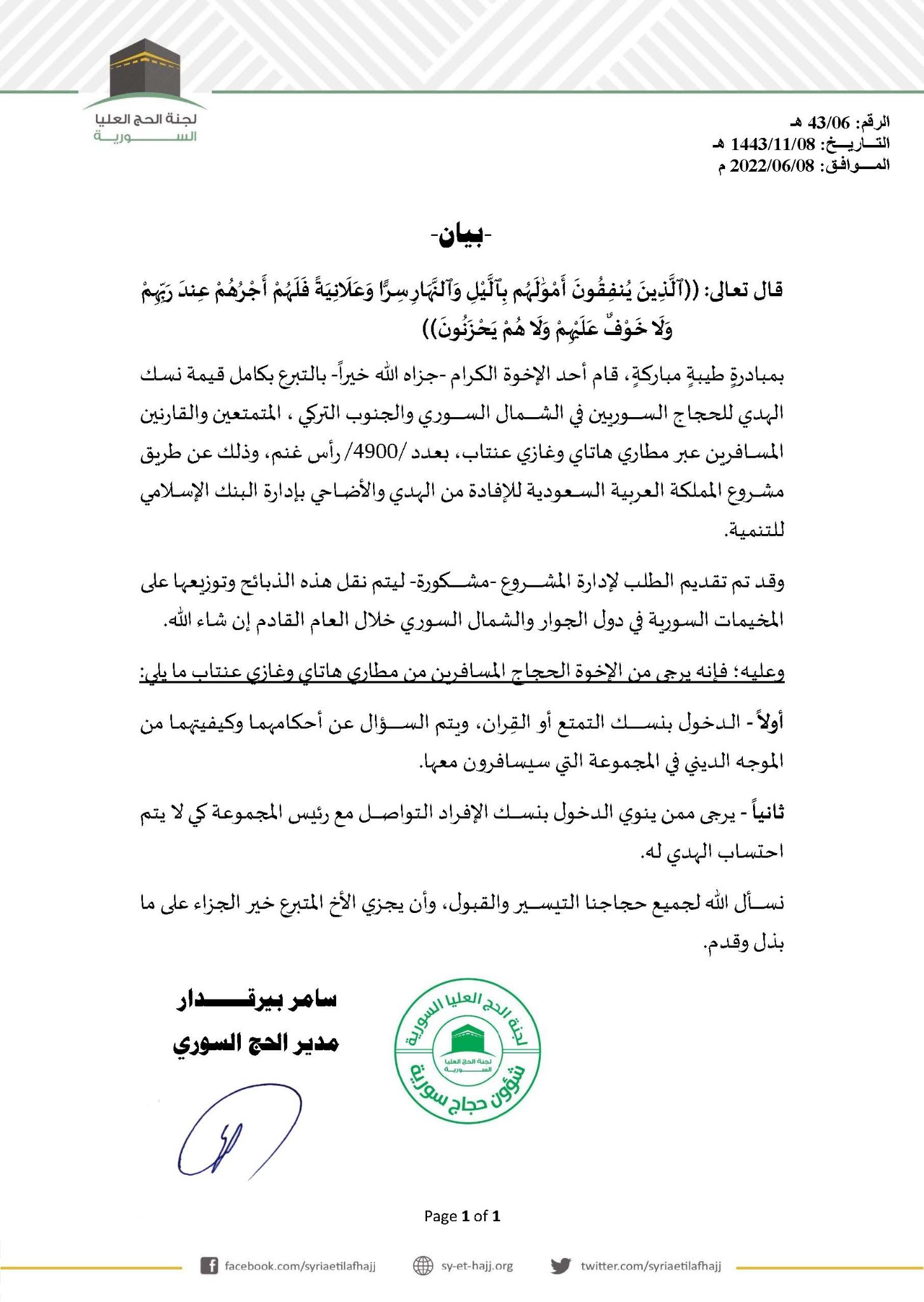 بمبادرةٍ طيبةٍ مباركةٍ، قام أحد الإخوة الكرام -جزاه الله خيراً- بالتبرع بكامل قيمة نسك الهدي للحجاج السوريين في الشمال السوري والجنوب التركي ، المتمتعين والقارنين المسافرين عبر مطاري هاتاي وغازي عنتاب، بعدد /4900/ رأس غنم، وذلك عن طريق مشروع المملكة العربية السعودية للإفادة من الهدي والأضاحي بإدارة البنك الإسلامي للتنمية.