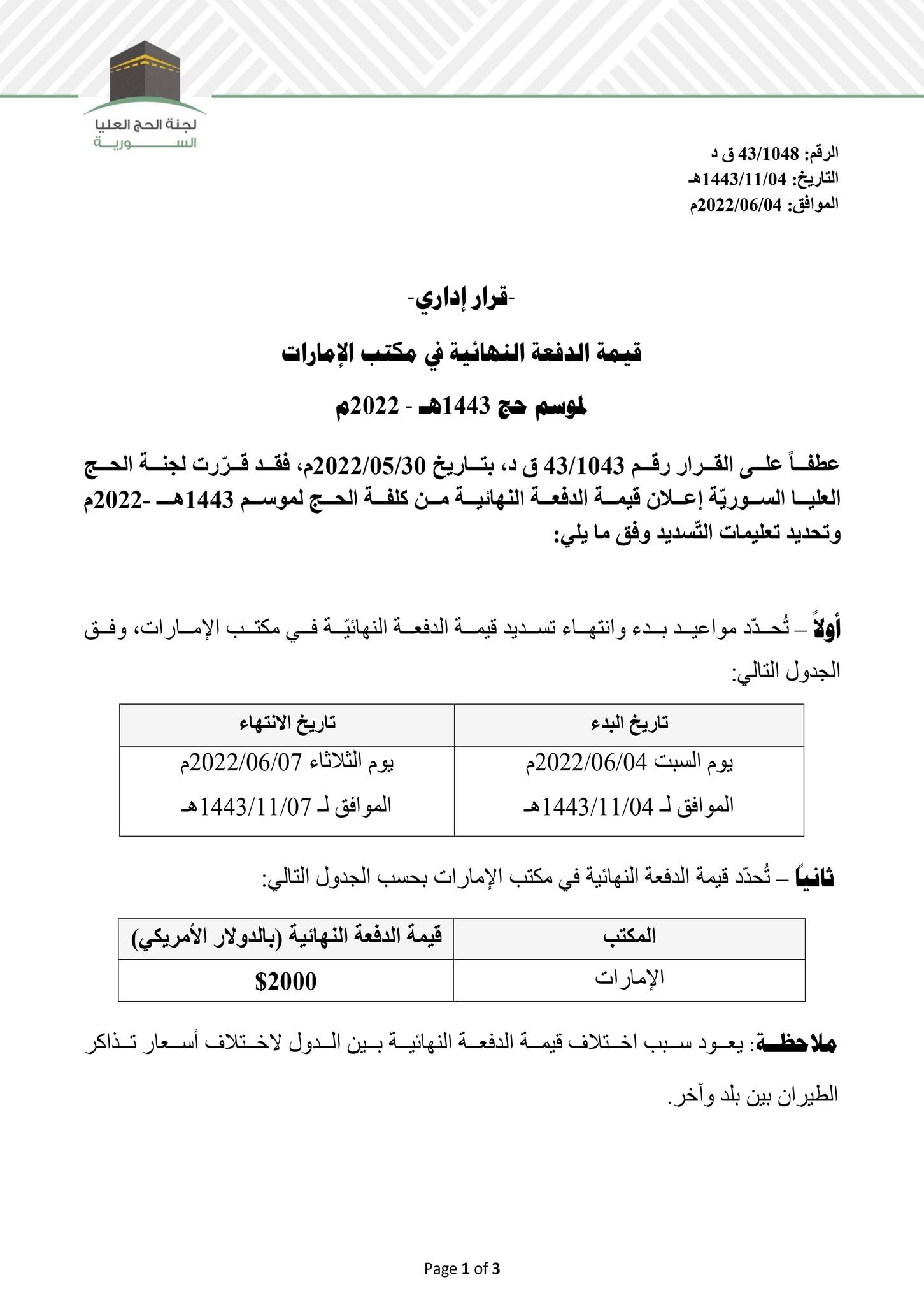 قيمة الدفعة النهائية في مكتب الإمارات لموسم حج1443هـ-2022م