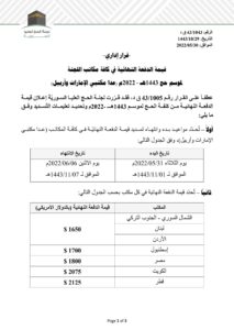 قرارات قيمة الدفعة النهائية في كافة مكاتب اللجنة لموسم حج 1443هـ -2022م (عدا مكتبي الإمارات وأربيل) قراءة المزيد » 30 مايو، 2022 لا توجد تعليقات